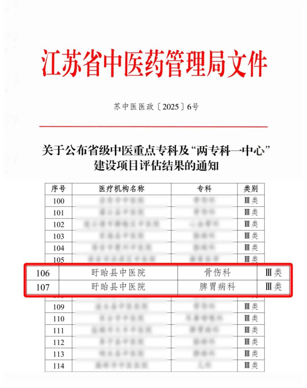 12月23日,江苏省中医药管理局公布省级中医重点专科及“两专科一中心”建设项目评估结果。盱眙县中医院骨伤科、脾胃病科被正式确认为省级中医重点专科。自此,盱眙县中医院省级中医重点专科数目增加至3个,学科建设再上新台阶。